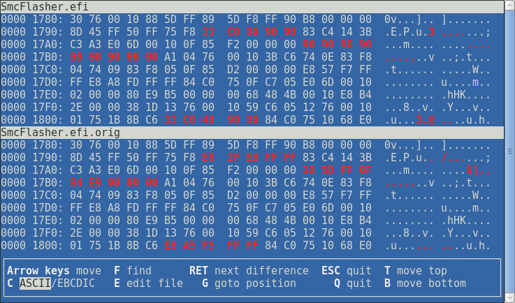 And the last 5 bytes replace the call to the function that prevents from downgrading the SMC firmware by xor eax, eax; inc eax; nop; nop.